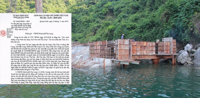 Cũng tại công văn này, UBND tỉnh Quảng Ninh cho biết, công trình cải tạo, nâng cấp bến cập tàu hang Tiên Ông và động Mê Cung, vịnh Hạ Long là 2 công trình nằm trong quy hoạch chi tiết bảo tồn và phát huy giá trị di sản vịnh Hạ Long đến năm 2020 được phê duyệt tại Quyết định số 1139, ngày 27/5/2015.