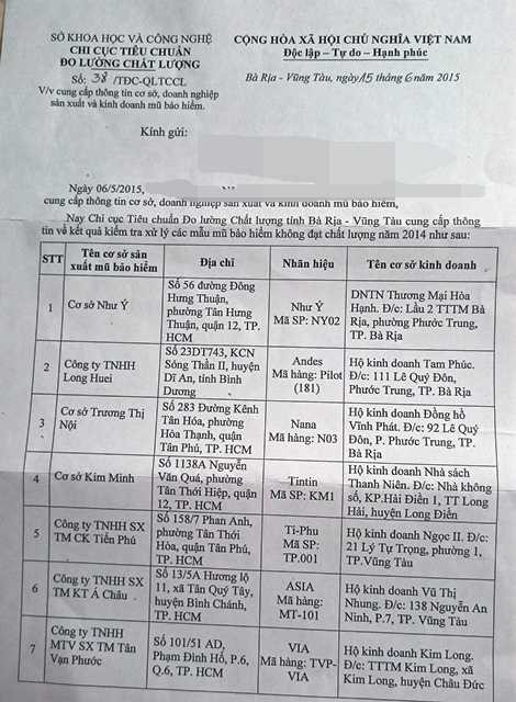 Mới đây, Chi cục tiêu chuẩn và đo lường chất lượng (Sở Khoa học & Công nghệ tỉnh Bà Rịa – Vũng Tàu) đã công bố 10 loại MBH có chỉ tiêu không đạt về độ bền va đập và hấp thụ xung động theo quy định tại Quy chuẩn kỹ thuật quốc gia QCVN 2:2008/BKHCN về MBH cho người đi mô tô, xe máy.