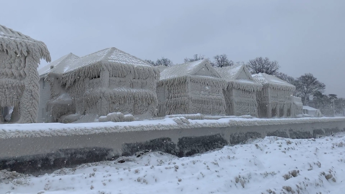 Hàng loạt ngôi nhà dọc theo bờ hồ Erie, Mỹ bị bao phủ bởi lớp băng dày khi những cơn bão mùa đông đổ bộ.