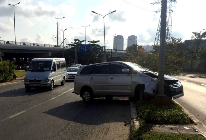 Vừa qua cầu Sài Gòn (phường 22, quận Bình Thạnh), do dầu nhớt đổ tràn trên đường, một tài xế mất kiểm soát, phương tiện lao lên dải phân cách, tông thẳng vào trụ đèn chiếu sáng. Vụ tai nạn may mắn không làm tài xế bị thương.