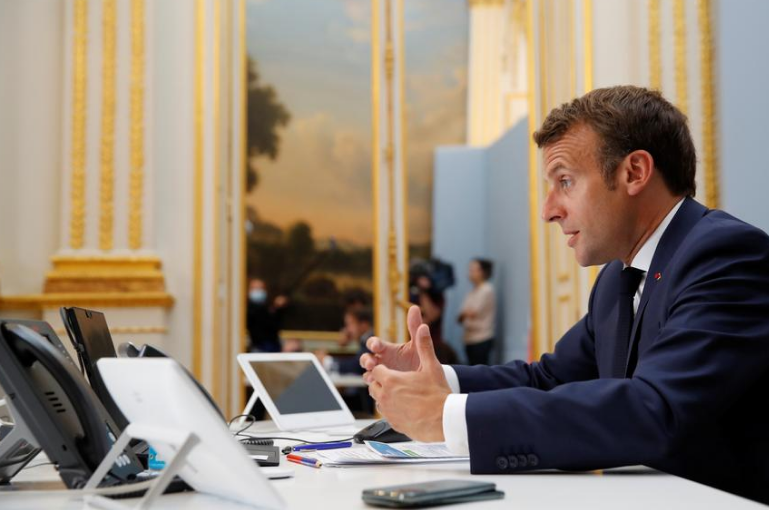 Tổng thống Pháp Emmanuel Macron tham gia vào cuộc họp trực tuyến. (Ảnh: Reuters)