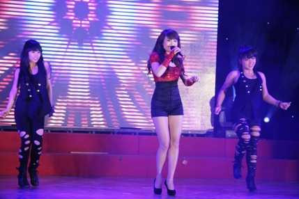 | Em gái của tuyển thủ Công Vinh- Lê Khánh Chi trong bộ trang phục bó sát, gợi cảm khoe vũ đạo khỏe khoắn với ca khúc "Ngày hạnh phúc" trong đêm nhạc "Mái trường bản tình ca" |