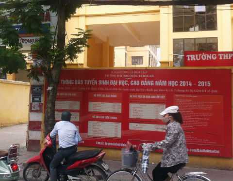 | Bảng thông báo tuyển sinh được dán nổi bật phía bên ngoài trường ĐH Quốc tế Bắc Hà. |
