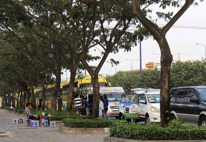 | Nhà xe Hoa Mai lập điểm điều xe, đón trả khách ngay trên đại lộ Mai Chí Thọ.Ảnh: Linh Hoàng. |
