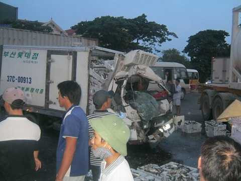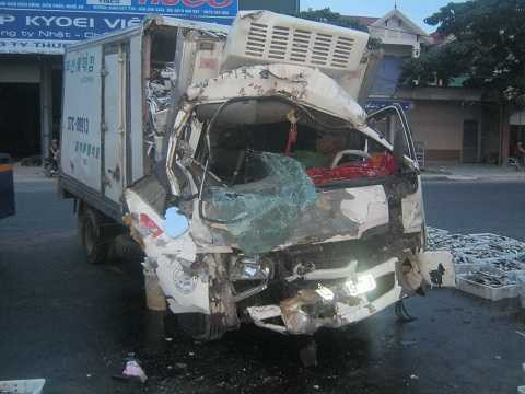 | Xe đông lạnh chở cá bị tông nát đầu |
