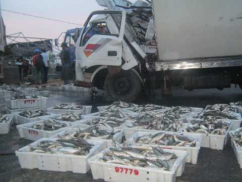Cú tông khiến đầu xe đông lạnh bẹp dúm, tài xế Hồng kẹt cứng trong cabin. Thùng xe đông lạnh bị bung, cá trên thùng xe đổ xuống trắng xóa đường.