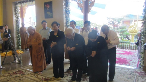 Nguyên Chủ tịch nước Nguyễn Minh Triết (giữa) dành một phút mặc niệm trước giác linh của cố Đại lão hòa thượng Thích Trí Tịn (ảnh: Giác ngộ online)