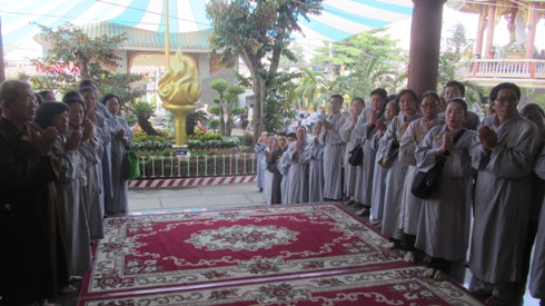 Hàng ngàn Phật tử đứng nghiêm trang hai bên lối vào chính điện chùa Vạn Đức để đón chào người dân vào viếng cố Đại lão hòa thượng Thích Trí Tịnh (Ảnh: T.Quân)