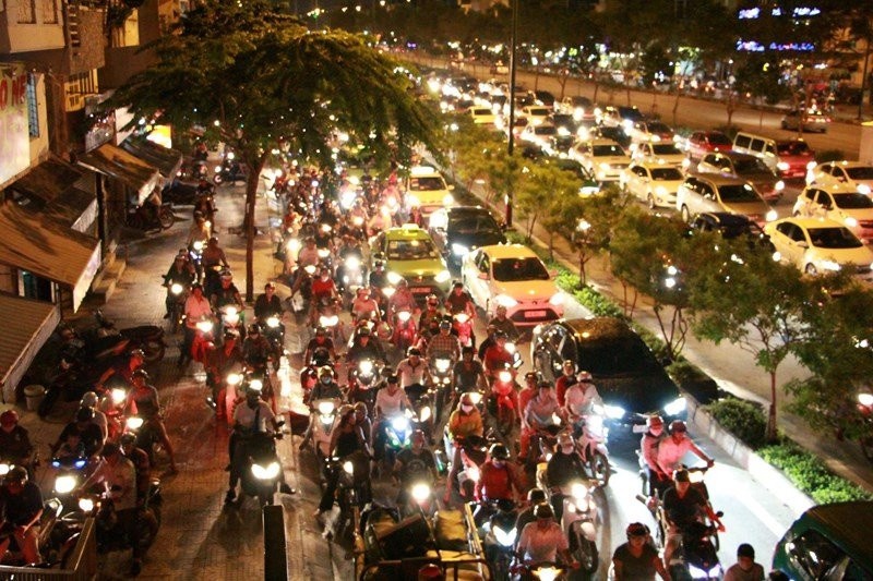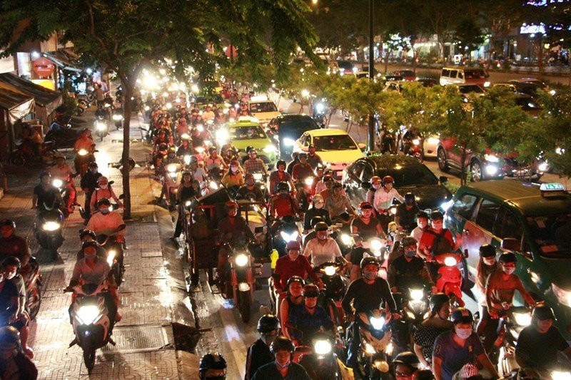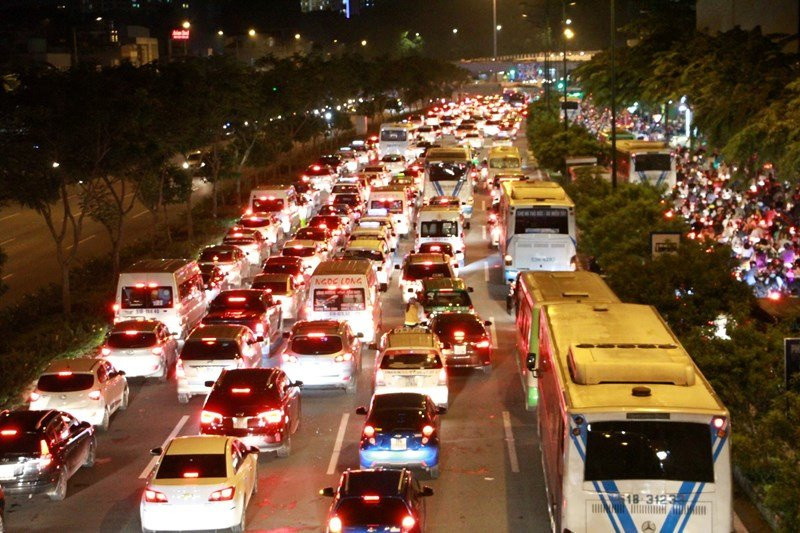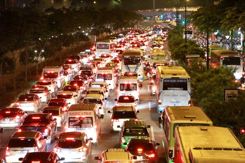 Hàng ngàn phương tiện nối đuôi nhau, xếp hàng dài trên đại lộ Phạm Văn Đồng tối Chủ nhật 26/11.