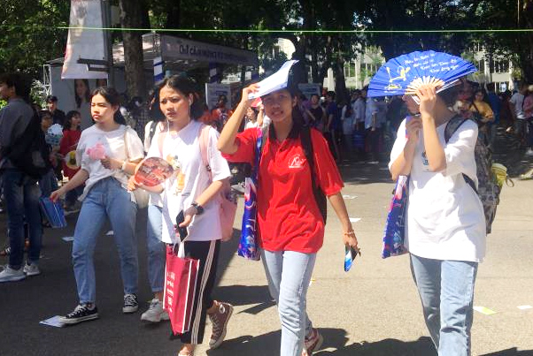 Trời nắng nóng, học sinh ngồi cả ở vỉa hè, dưới bóng cây để nghe tư vấn.