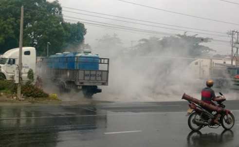 | A xít chảy xuống mặt đường, bốc khói nghi ngút. |