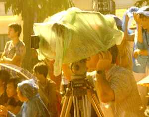 Ảnh người dân đội mưa xem múa cổ Để ghi lại những hình ảnh đêm nghệ thuật, phóng viên báo chí phải nhường áo mưa cho phương tiện tác nghiệp mình.