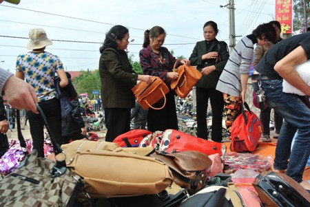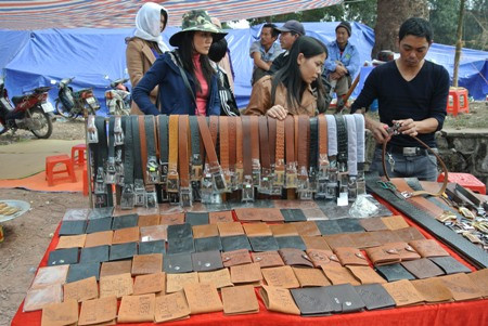 Nếu như cổng chào vào hội là “đại bản doanh” của các mặt hàng chăn, ga, gối, nệm thì khu vực chính hội lại bày bán la liệt đủ loại ví da, thắt lưng, đồ trang sức giả, đồ chơi xuất xứ Trung Quốc…