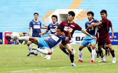 | ĐH Sư phạm Thái Nguyên (xanh) chơi bóng bổng khiến cho việc chống đỡ của ĐH Đà Nẵng (nâu) rất vất vả. (Ảnh: Hà Thành) |