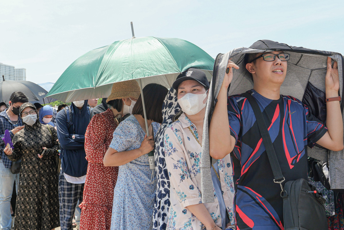 Dưới cái nắng "đổ lửa" nhiều người phải trang bị ô, áo chống nắng để đứng xếp hàng.