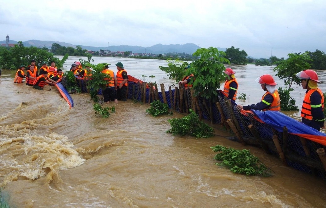 Cán bộ, chiến sĩ Công an tỉnh và Quân đội cùng nhau vận chuyển vật dụng phòng chống lụt bão, đất cát, dầm mình trong nước để đóng cọc tre và đắp bao đất. Các lực lượng đã sử dụng cả hàng rào B40 và bạt để tạo thành vách ngăn, cách ly dòng nước, không cho tràn sâu vào khu dân cư.