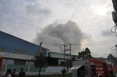 Lửa gặp hóa chất dễ cháy nhanh chóng lan ra, bao trùm nhà xưởng rộng 5.000 m2. Khói đen mù mịt lan tỏa, hơi hóa chất bốc lên gây ngạt cả khu vực khiến công nhân các công ty kề bên không thể làm việc.