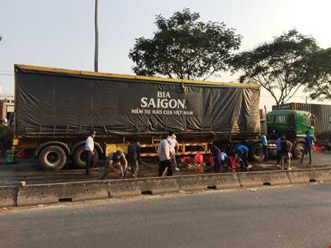 Khi đến gần cầu Gò Dưa (phường Bình Chiểu, quận Thủ Đức), do tài xế tránh một phương tiện khác chạy cùng chiều nên đã thắng gấp khiến nhiều thùng bia phía sau bị dồn lại.