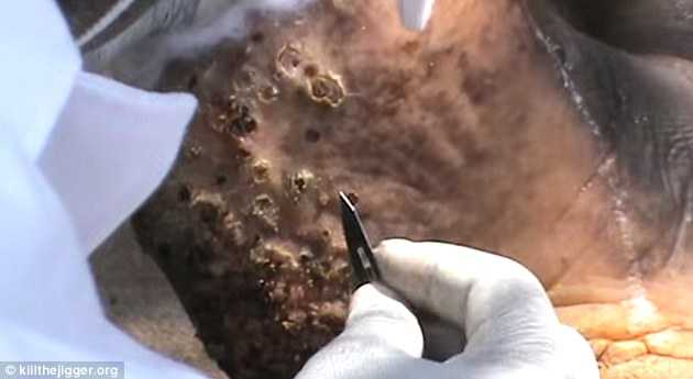 Chân người đàn ông có hàng trăm con bọ chét kí sinh. Cách duy nhất để chữa trị là lấy chúng ra khỏi cơ thể mà không dùng thuốc tê, sau đó ngâm trong dung dịch sát khuẩn để tiêu diệt hết trứng của chúng. Những con bọ kí sinh này gây ra ngứa, sưng, loét, thậm chí người bệnh phải cắt đi bộ phận bị hoại tử do quá nhiều con bọ ki sinh.