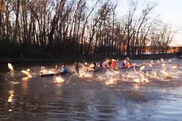 Các sinh viên trường đại học Washington, Mỹ đang tham gia buổi luyện tập bơi thuyền trên hồ Creve Coeur, ở Missouri thì hàng trăm con cá chép nhảy lên