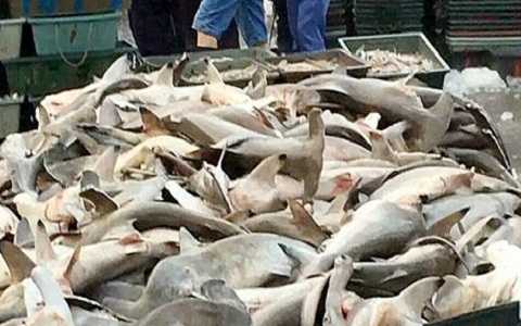 | Hàng trăm con cá mập đầu búa chết và chất thành đống bán với giá rẻ mạt. Ảnh Dailymail |