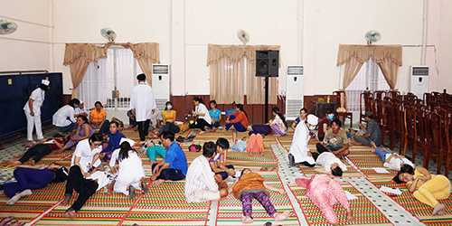 | Bệnh viện Đa khoa tỉnh Bình Dương tận dụng hội trường làm nơi tiếp nhận, thăm khám cho bệnh nhân ngộ độc nhẹ. Ảnh: N.T. (VNE) |
