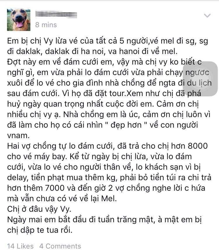 Mấy ngày nay, hàng trăm du học sinh ở Úc đang hoang mang lo lắng, chạy đôn chạy đáo kêu cứu tới các cơ quan chức năng của Úc vì đã đặt mua vé máy bay của đại lý có tên trên Facebook (FB) là Vi Tran, nhưng đã bị lỡ hành trình vì không có tên trên các chuyến bay. Sự việc đang trở nên bức xúc trên cộng đồng mạng, nhất là trên FB Hội sinh viên ở Úc với hàng trăm lượt thông tin phản hồi.