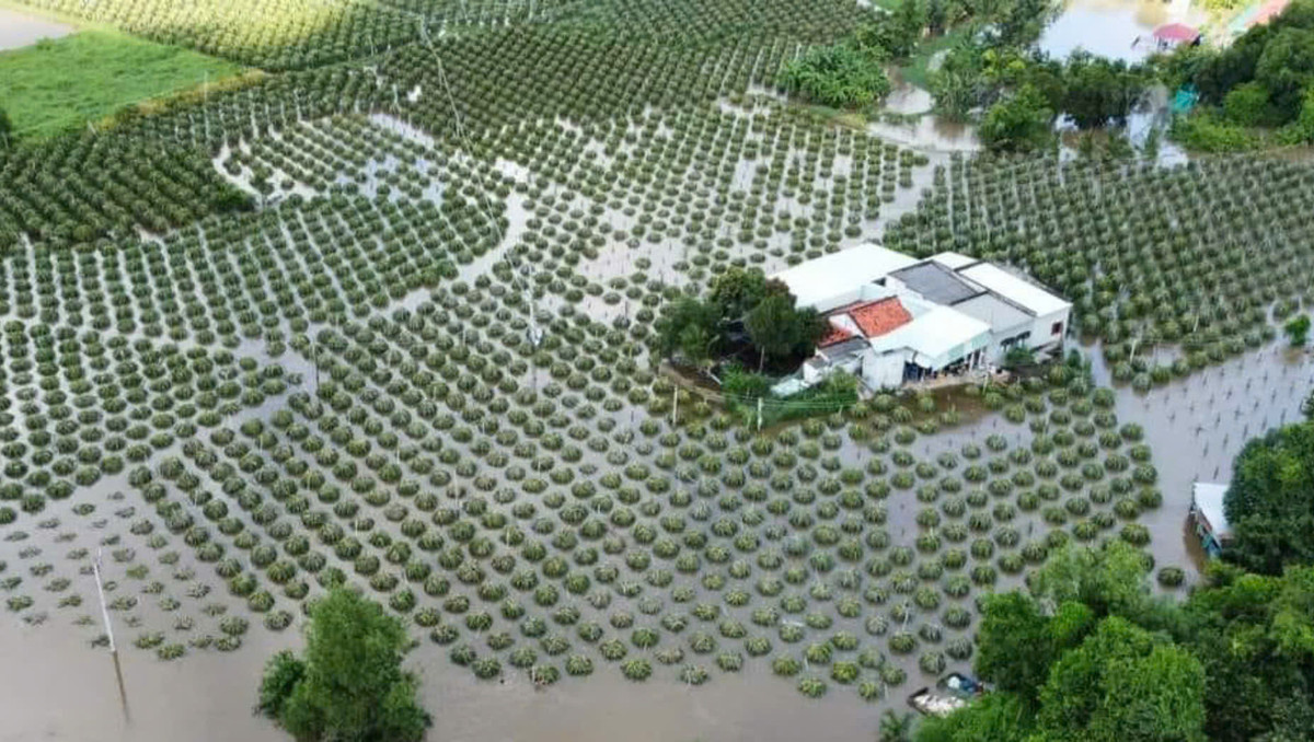 Nhiều vườn thanh long chỉ còn thấy ngọn, các tuyến đường liên thôn, liên xã vẫn bị chia cắt.