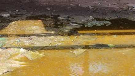 | Hàng trăm lít hóa chất tràn xuống đường. Ảnh: Đông Sơn. |