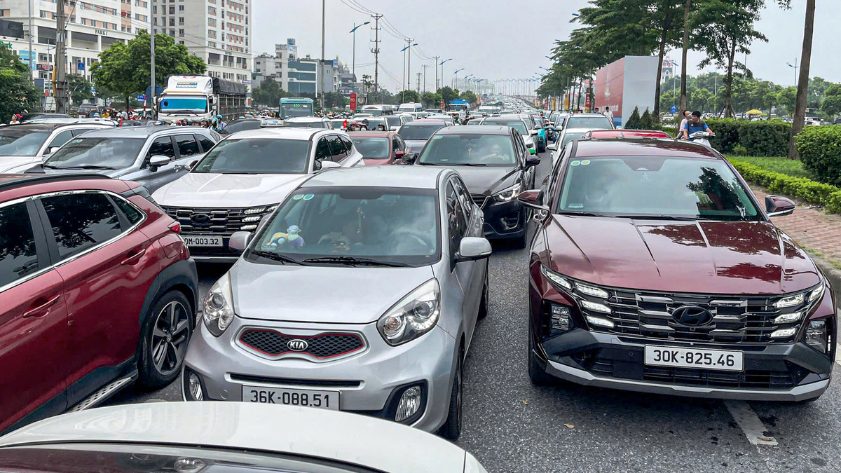 Dòng phương tiện chen chúc, di chuyển từng mét một, nhiều ô tô buộc phải dừng ngay ven đường vì không thể tiến vào khu trung tâm.