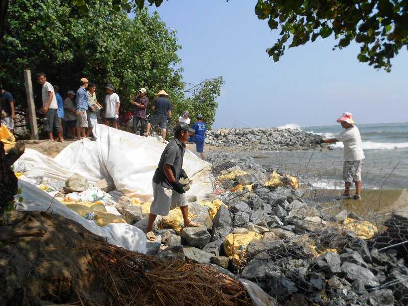 Hàng trăm người tấp nập đắp đê biển chống bão số 7