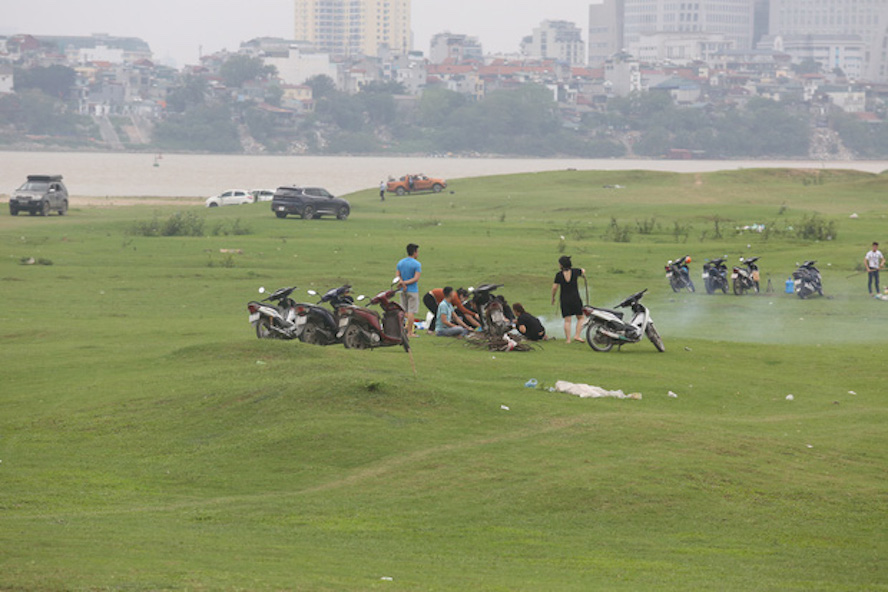 Chiều 29/3, bất chấp lệnh cấm tập trung đông người của Chính phủ và UBND TP Hà Nội để ngăn ngừa sử lây lan của dịch Covid-19, hàng trăm người vẫn rủ nhau tụ tập, ăn uống, đá bóng ngay dưới bãi đất gần chân cầu Vĩnh Tuy (Hà Nội).