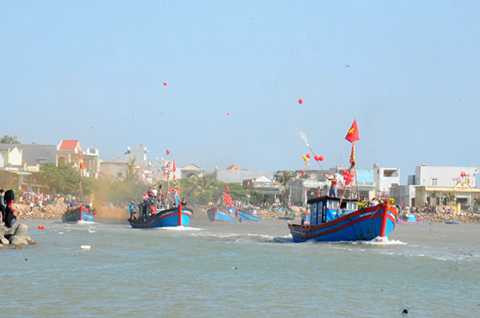 Trên bờ, hàng nghìn người dân đứng chật kín con lạch ra đến tận cửa biển reo hò cổ vũ, những người vợ, người mẹ đưa tay vẫy chào chồng con xuất biển.