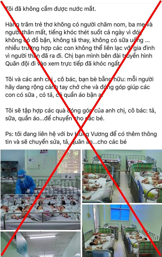 Những ngày qua mạng xã hội Facebook lan truyền bài đăng kèm hình ảnh hàng trăm trẻ em, trẻ sơ sinh được cho là có mẹ là F0, ba mẹ mất vì COVID-19 tại Bệnh viện Hùng Vương không ai chăm nom, thiếu tã, sữa, quần áo, khóc thét suốt cả ngày vì đói...