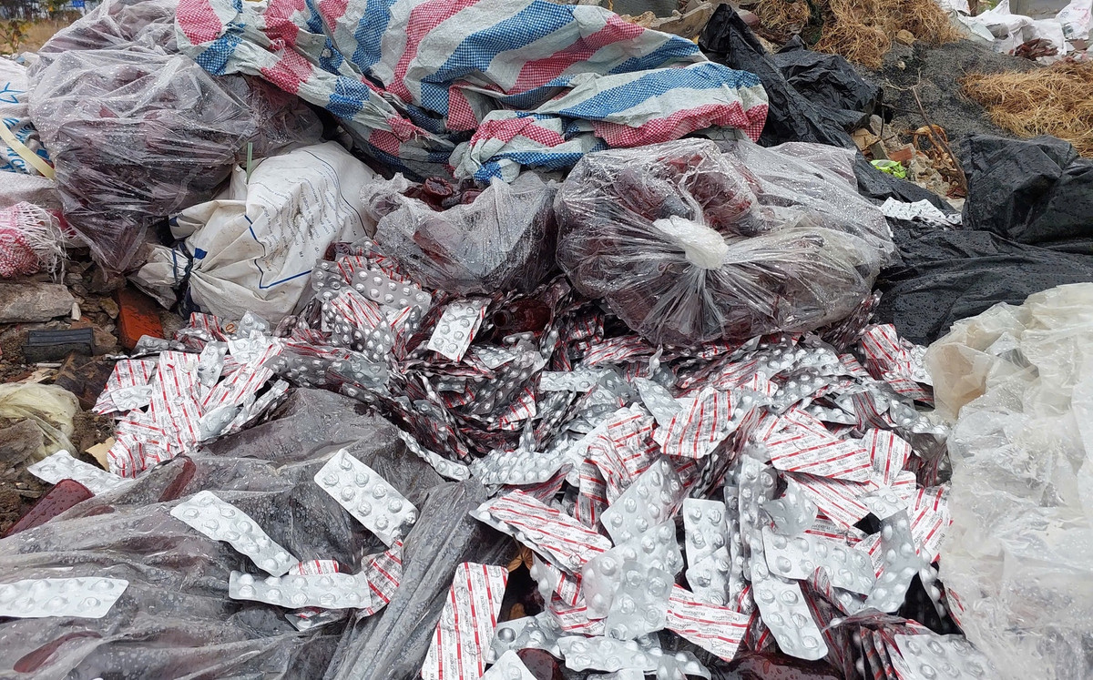 Hàng trăm vỉ thuốc tân dược bị vứt bỏ tại bãi rác ở Đà Nẵng. (Ảnh: T.H)