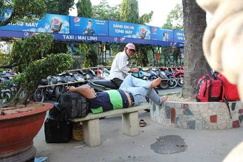 | Hành khách đợi xe nằm dài ghế đá tại bến xe Miền Đông Ảnh:Phan Cường |