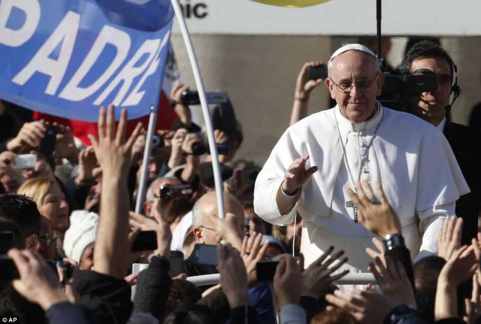 | Giáo hoàng Fracis di chuyển trên quảng trường St Peter bằng chiếc xe mui trần màu trắng để vẫy chào những người có mặt trong lễ nhậm chức của ngài |