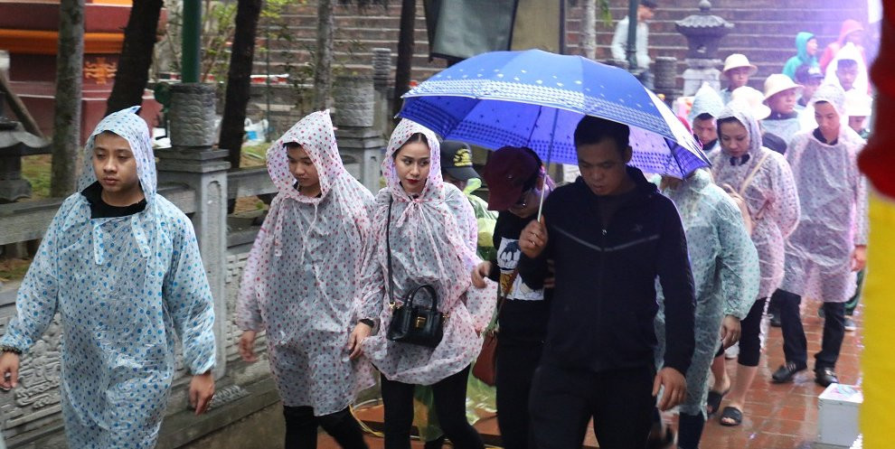 Trước thời gian diễn ra buổi lễ xuất hiện cơn mưa Xuân khiến việc đi lại của du khách gặp nhiều khó khăn. (Ảnh: Tùng Lâm)