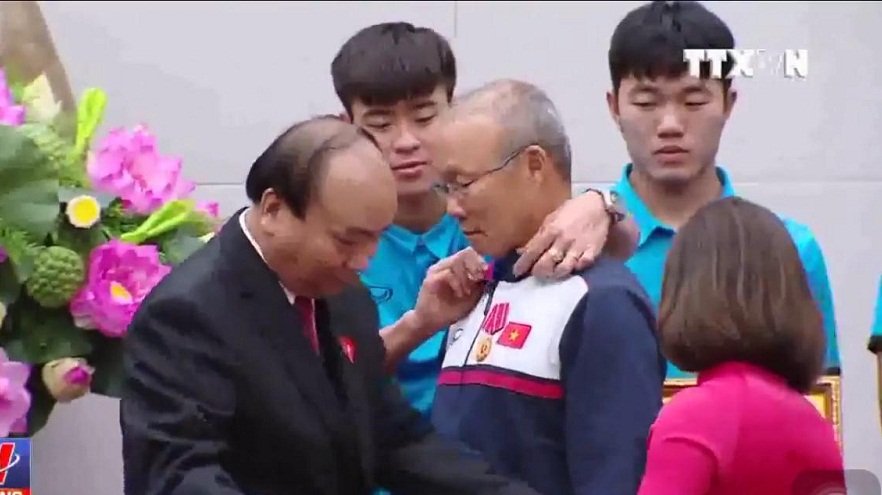 Trong lúc Thủ tướng Nguyễn Xuân Phúc trao Huân chương Lao động hạng Ba cho HLV Park Hang Seo, Duy Mạnh cẩn thận chỉnh lại cổ áo cho thầy trước khi chụp ảnh lưu niệm.