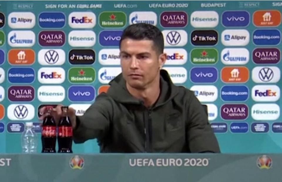 Trong cuộc họp báo trước trận đấu giữa Bồ Đào Nha và Hungary tại vòng bảng Euro 2020, Cristiano Ronaldo phát hiện hai chai Coca Cola trên mặt bàn.