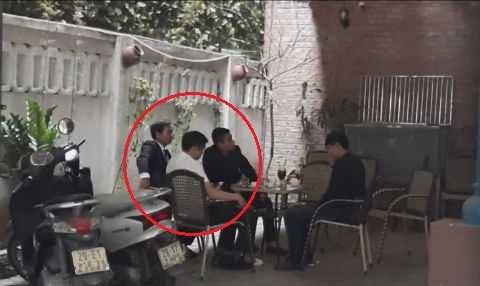 | 3 người đàn ông canh giữ không cho phóng viên Quang Hải rời khỏi quán cà phê. |