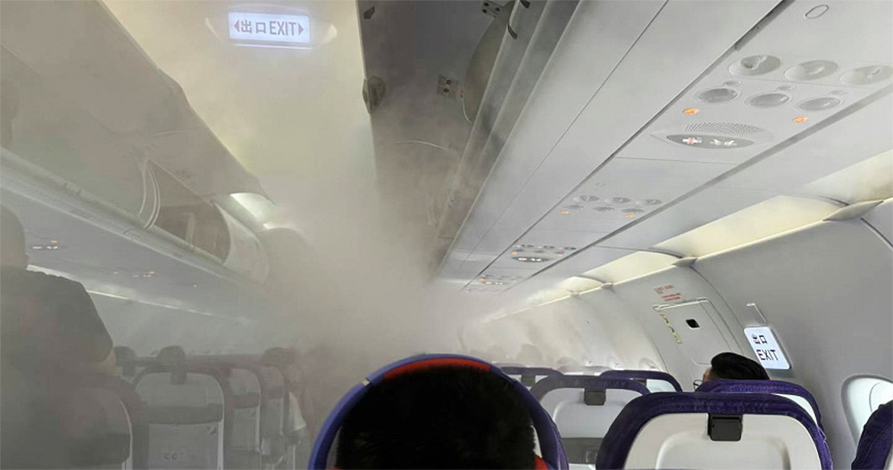 Khoang máy bay của Spring Airlines tràn ngập sương mù trắng. (Ảnh: Xiaohongshu)