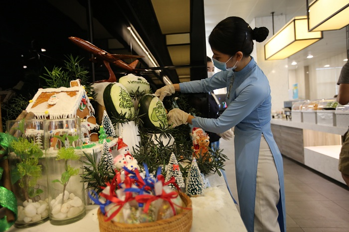 Tại mặt đất, các phòng khách Bông Sen được trang trí rực rỡ và công phu, chào đón hành khách với không gian ngập tràn màu sắc Giáng sinh.