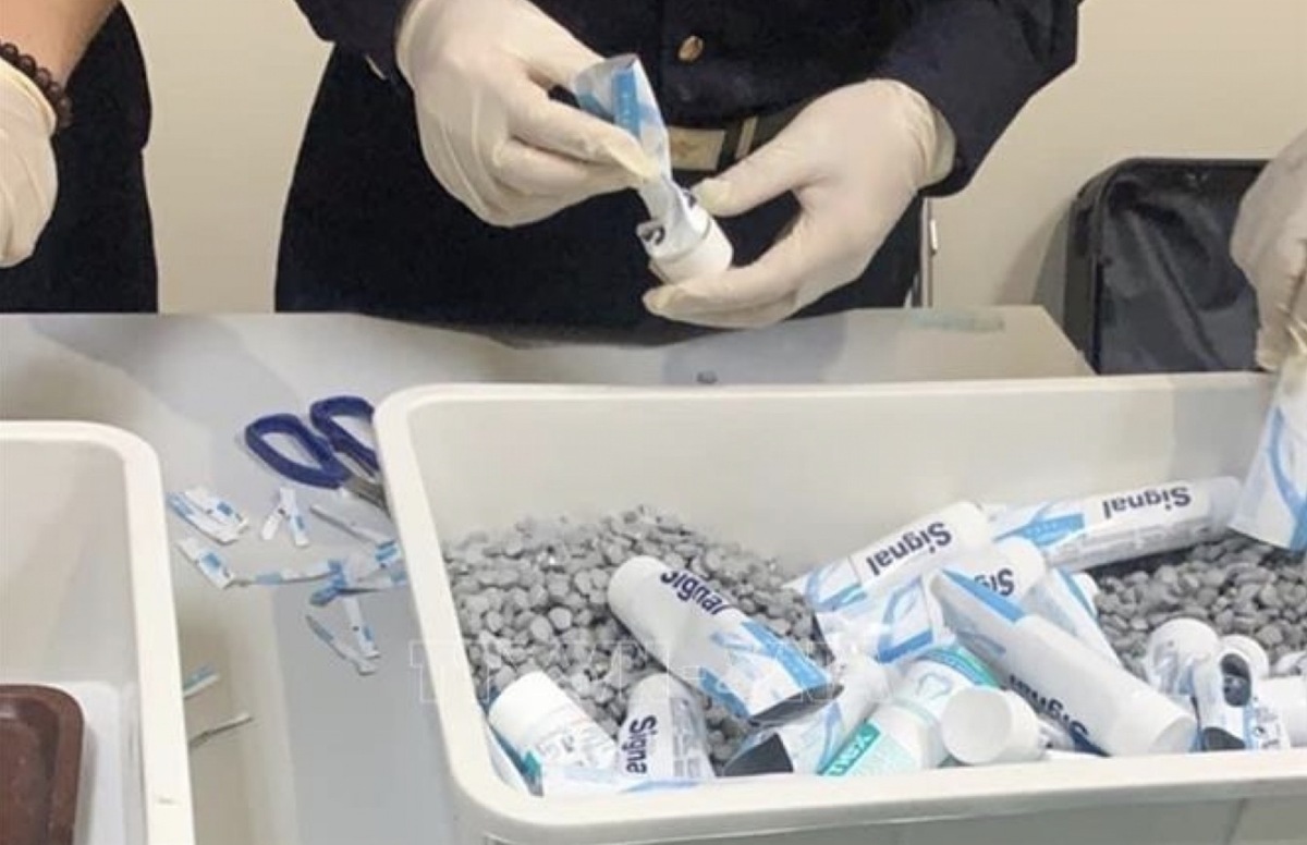 Kiểm đếm lô hàng chất ma túy được giấu trong những tuýp kem đánh răng bị thu giữ từ hành lý của 4 tiếp viên hàng không. (Ảnh: TTXVN)
