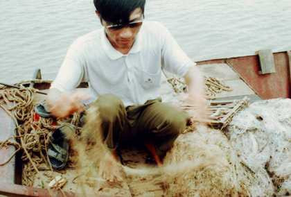 | Mù 2 mắt, nhưng hàng ngày anh Thắng vẫn thả lưới kiếm sống. |