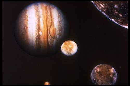 Sao Mộc và những mặt trăng của nó bao gồm Europa, Ganymede và Callisto được chụp lại bởi tàu thăm dò Voyager 1.