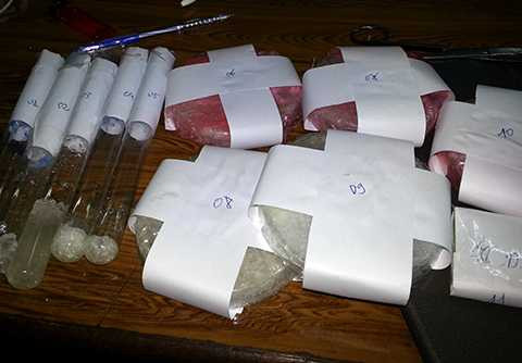 Tiến hành khám xét cả hai nơi ở, lực lượng công an đã phát hiện và thu giữ 5,2 kg ma túy đá tại địa chỉ phố Định Công và 30g ma túy đá, tại đây còn thu giữ một số hóa chất và ống nghiệm thủy tinh tại phố Ngọc Hà.