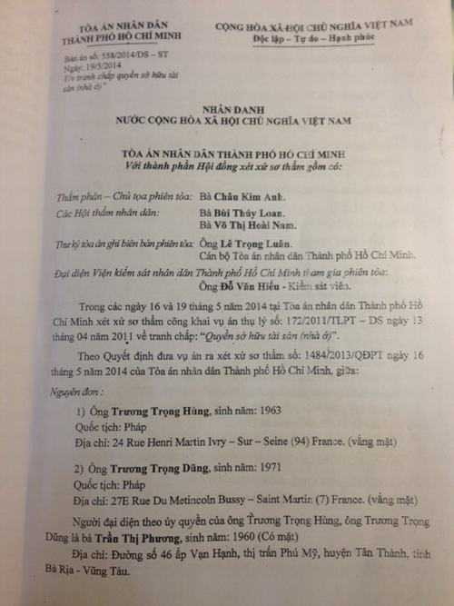 Trong các ngày 16 và 19/5/2014 tại TAND TP HCM xét xử sơ thẩm công khai vụ án thụ lý số 172/2011/TLPT-DS ngày 13/4/2011 về tranh chấp quyền sở hữu tài sản (nhà sở) giữa nguyên đơn là ông Trương Trọng Hùng, sinh năm 1963, quốc tịch Pháp, địa chỉ: 24 Rue Henri Martin Ivy-Sur-Seine (94) France (Vắng mặt), ông Trương Trọng Dũng, sinh năm 1971, quốc tịch Pháp, địa chỉ: 27E Rue Du Metincoln Bussy – Saint Martin (7) Fance (Vắng mặt).