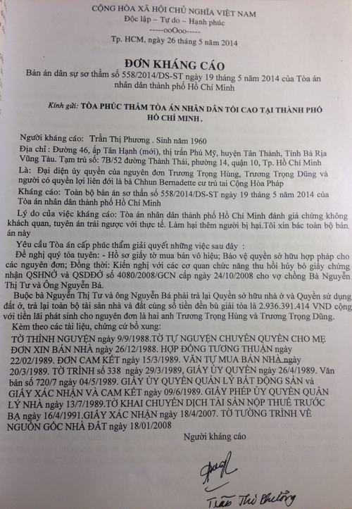 | Đơn kháng cáo bản án sơ thẩm số 558/2014/DS-ST của bà Trần Thị Phương |