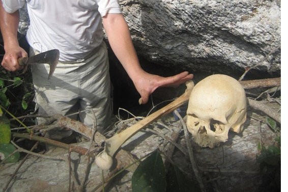 Một chiếc hộp sọ và xương ống chân ở hang ma. (ảnh Lê Bền)
